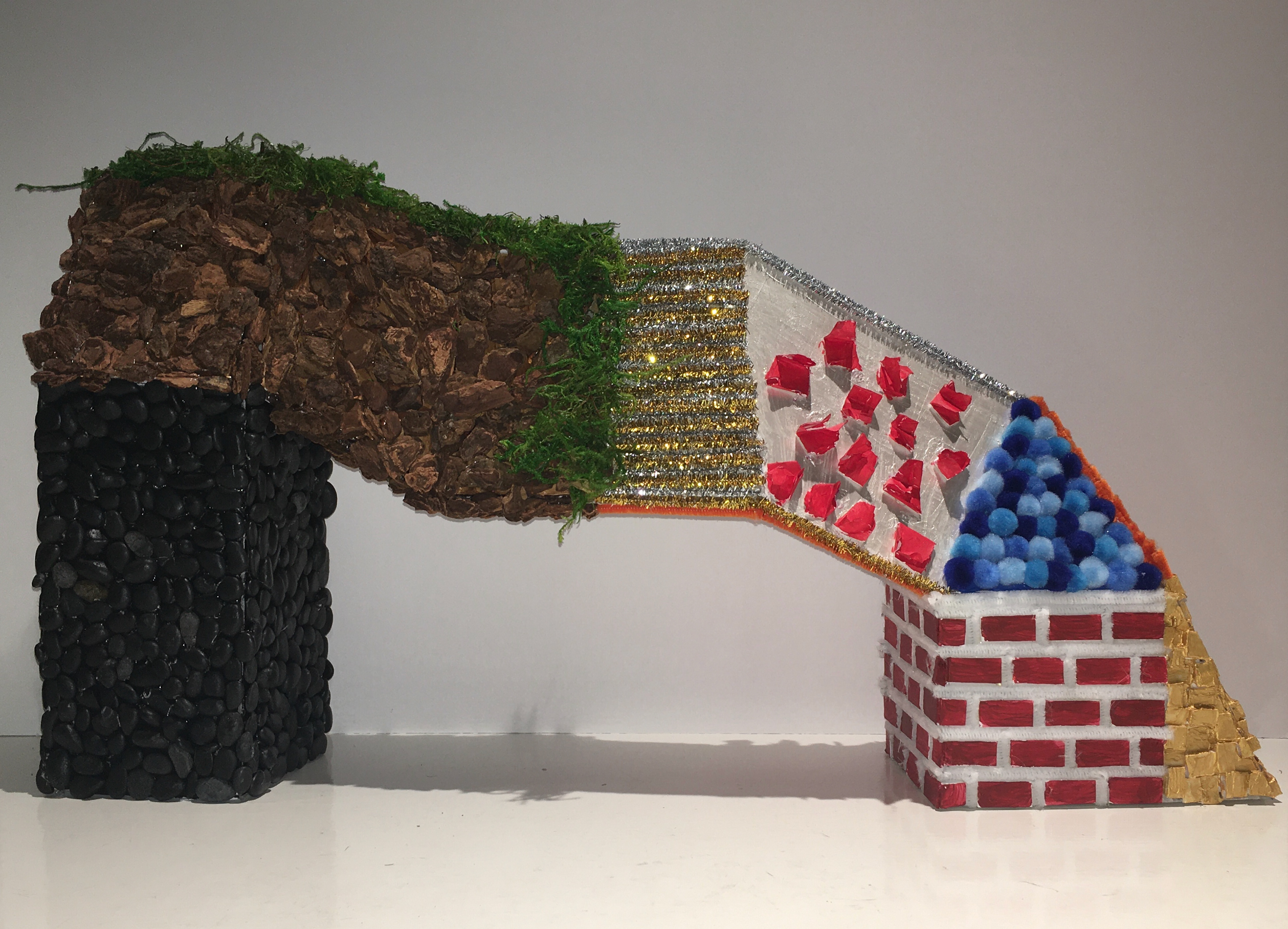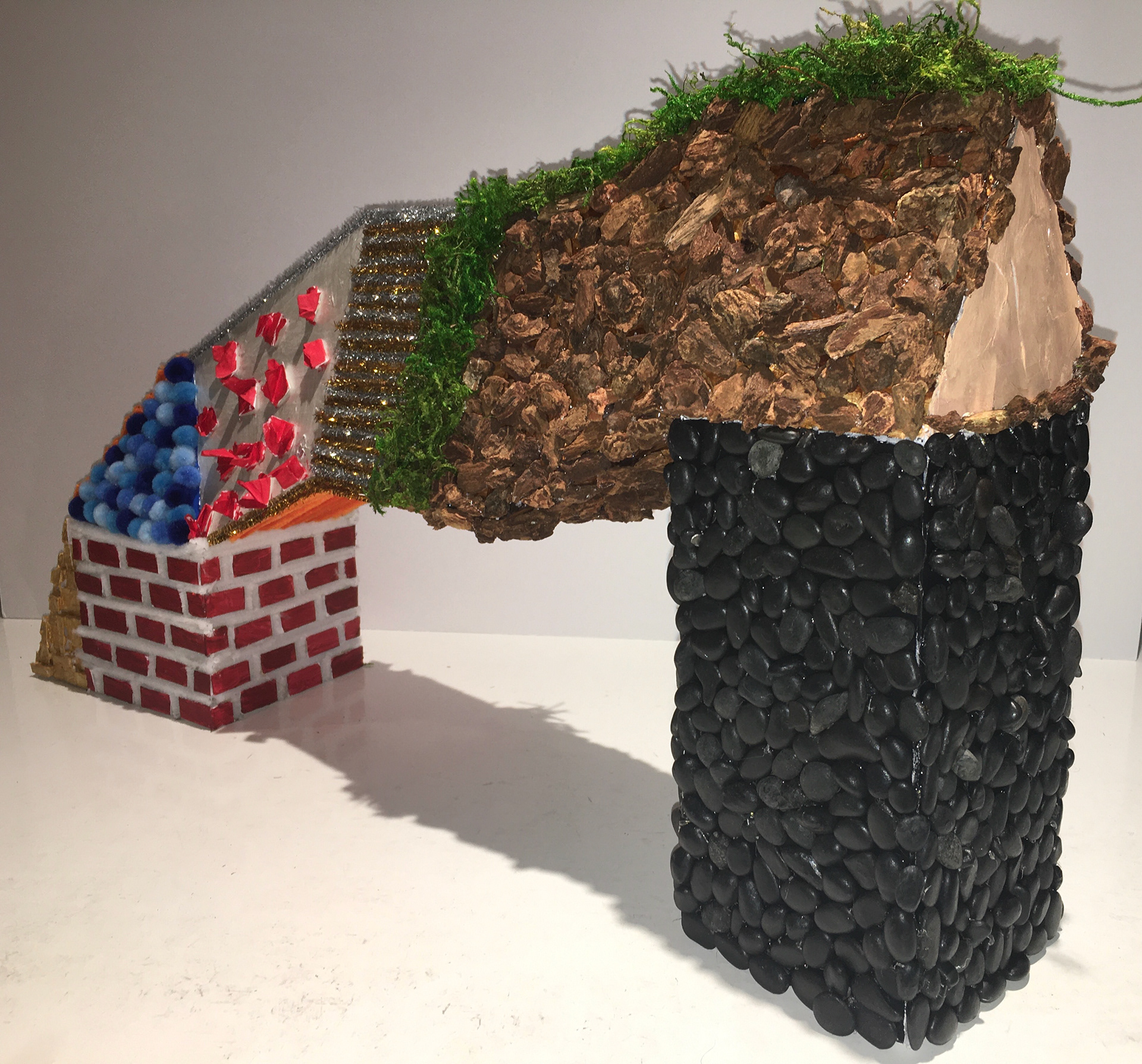 For this project we were instructed to create a 3D geometric structure using primarily foam board and whatever other material we wanted. I chose to create my structure in an arch-like shape so that it could stand on its own in a stable manner. The surface design consists of a wide variety of different materials so as to evoke a more surrealist and dreamlike aesthetic. Some of these materials include pipe cleaners, cotton balls, mulch, rocks, fake moss, paper, and pieces of foam board I cut and painted.