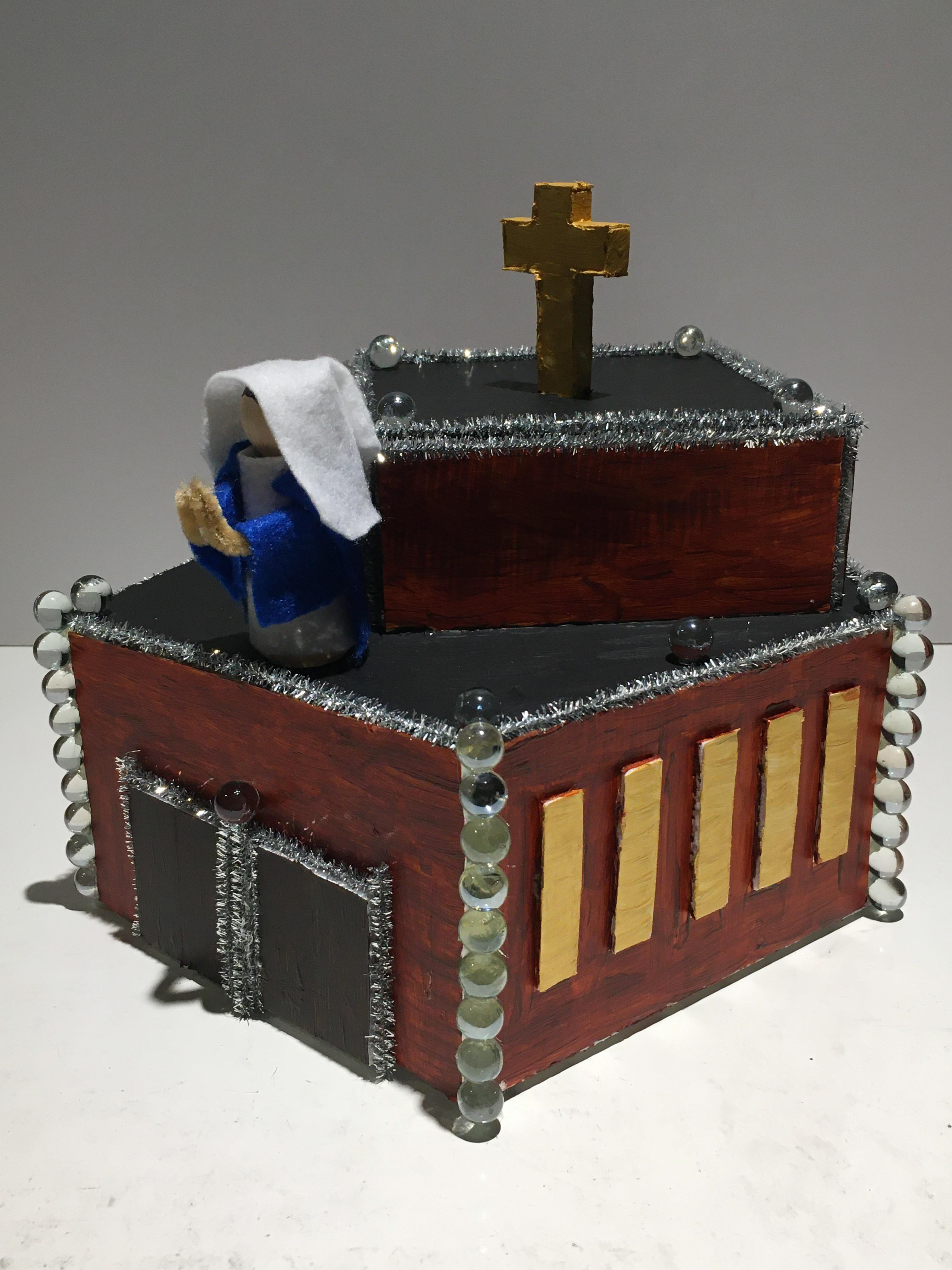 The guidelines for this project were that we had to create a piece that connected to a form of daily tradition or ritual we researched. As a Roman Catholic, I wanted to base my project around the ritual of praying the Rosary. The various elements of this ritual are incorporated into the design of the finished project. For starters, the structure of the project is designed to resemble a church since the ritual is primarily practiced by Catholics. The church is designed in a pentagon shape with four of these sides representing the Four Mysteries of the Rosary (Joyful, Luminous, Sorrowful, and Glorious) and the front serving as an entrance. Each of these Mystery sides include five windows, which each represent the various events from the lives of Jesus Christ and the Virgin Mary that you meditate on while focusing on while praying. On each corner are ten marbles representing the ten Hail Mary prayers one would recite when meditating on these individual events (that's about 50 Hail Marys for each Mystery). Atop the church are the crucifix, four smaller beads, and a model of the Virgin Mary to simulate the tail beads of the Rosary that you begin and end the overall prayer with.