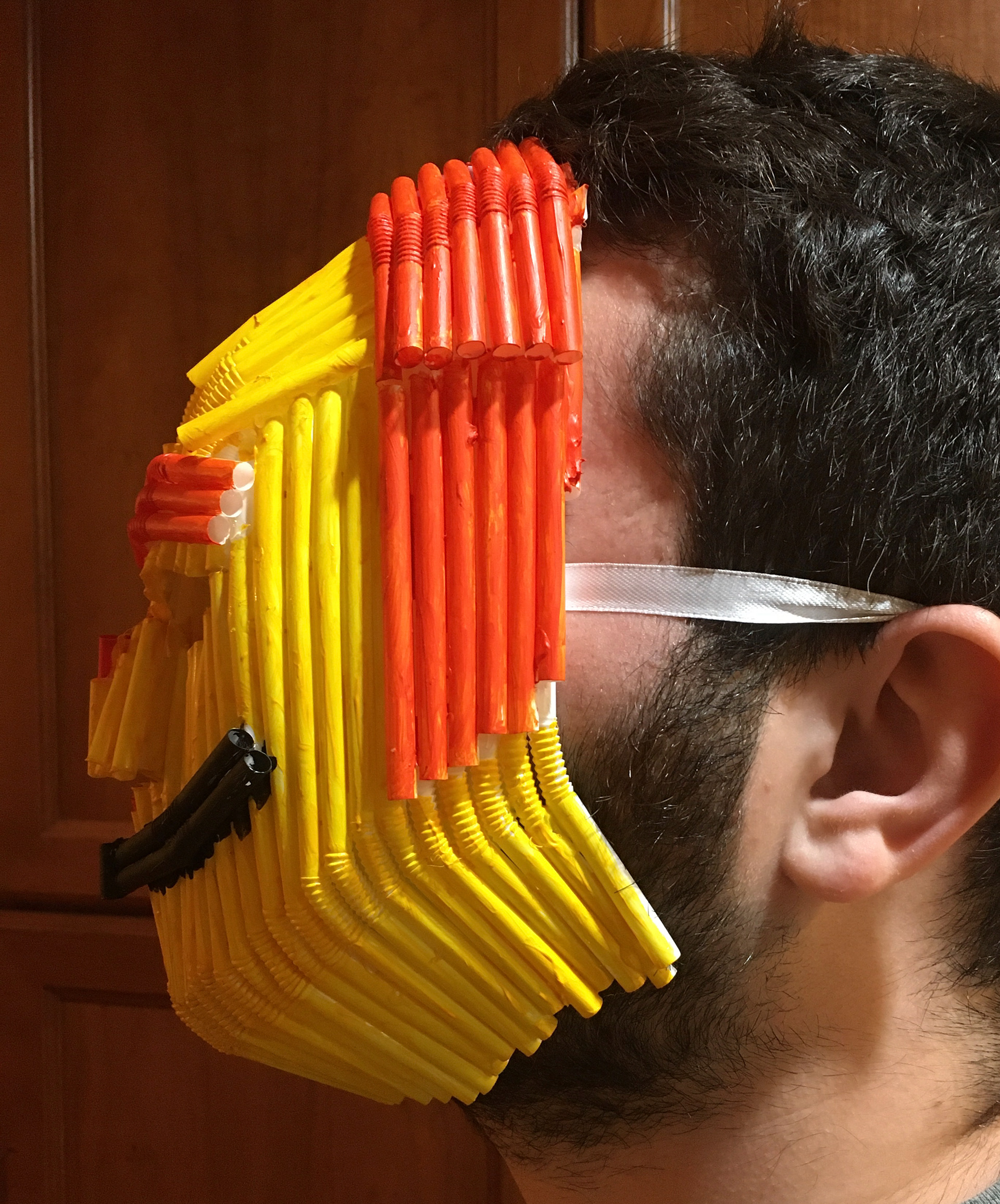 For this project, our class was tasked with designing some form of "wearable multiple" (i.e. clothing) using everyday objects. I chose to make my multiple a decorative mask that could be worn over the face. The mask is made of individual plastic drinking straws stuck together via hot glue and painted accordingly. To give my mask more visual flare, I decided to split it into two contrasting expressions: anger and happiness. The red side of the mask represents the former emotion while the yellow and orange side represents the latter.