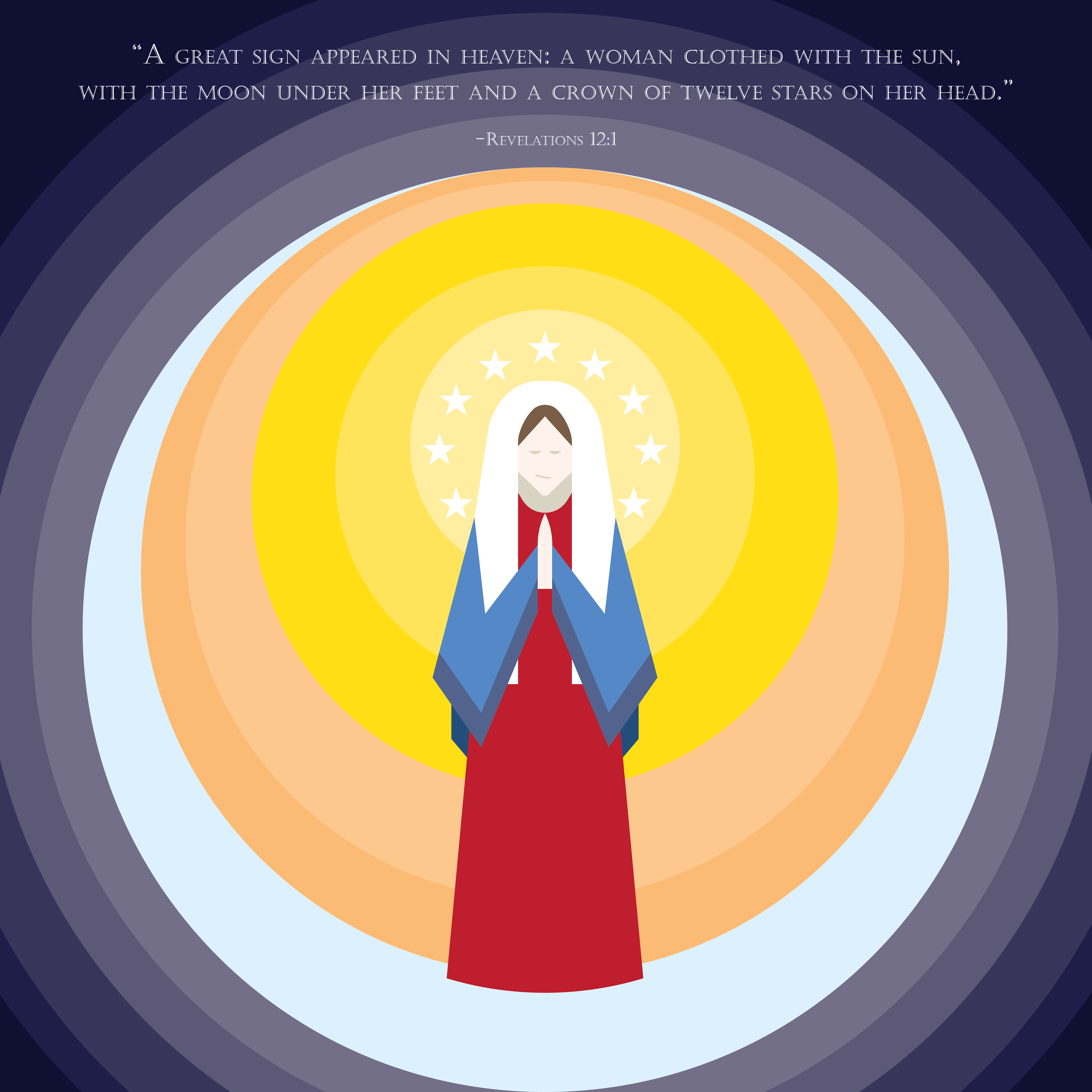 This is a personal piece I made depicting the Blessed Virgin Mary in honor of the Feast of the Immaculate Conception. The composition is directly based on how she is described in the Bible, specifically in Revelations 12:2 (the quote of which is positioned at the top).