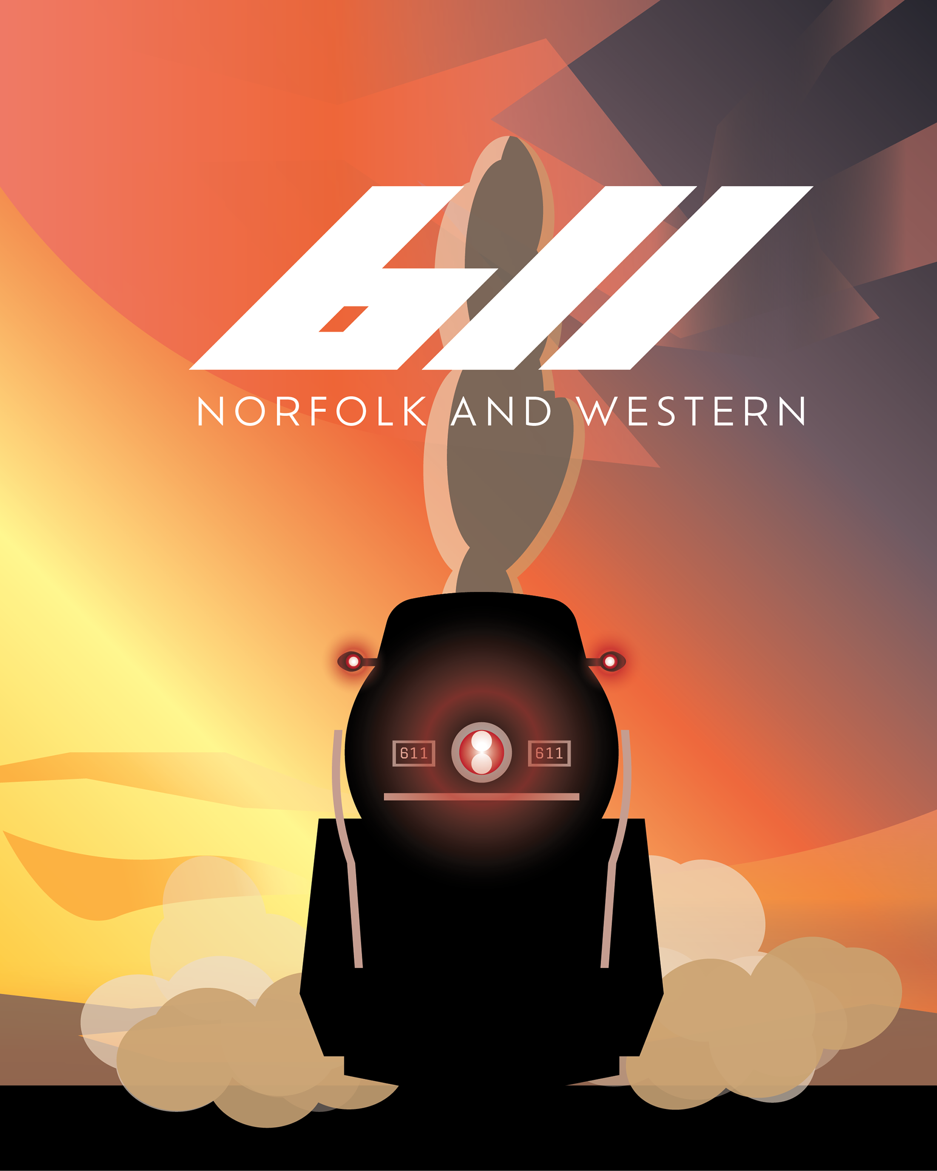 This is a personal piece I made depicting the steam locomotive Norfolk and Western Railway #611. This illustration is directly based on the official poster for the 2025 film F1: The Movie but with a locomotive instead of a race car.